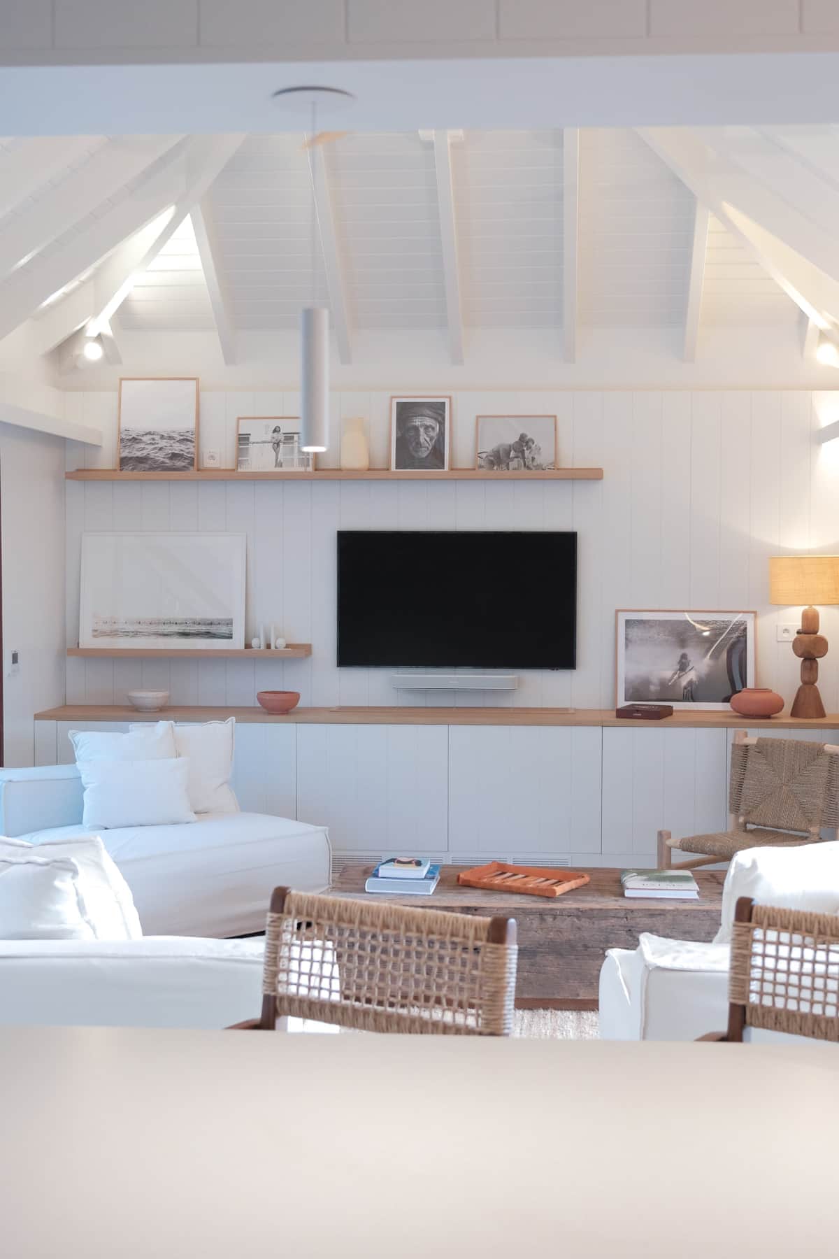 La villa dispose d’un vaste séjour climatisé, élégant et chaleureux, équipé d’un canapé confortable et d’une TV Samsung Frame 55 pouces.